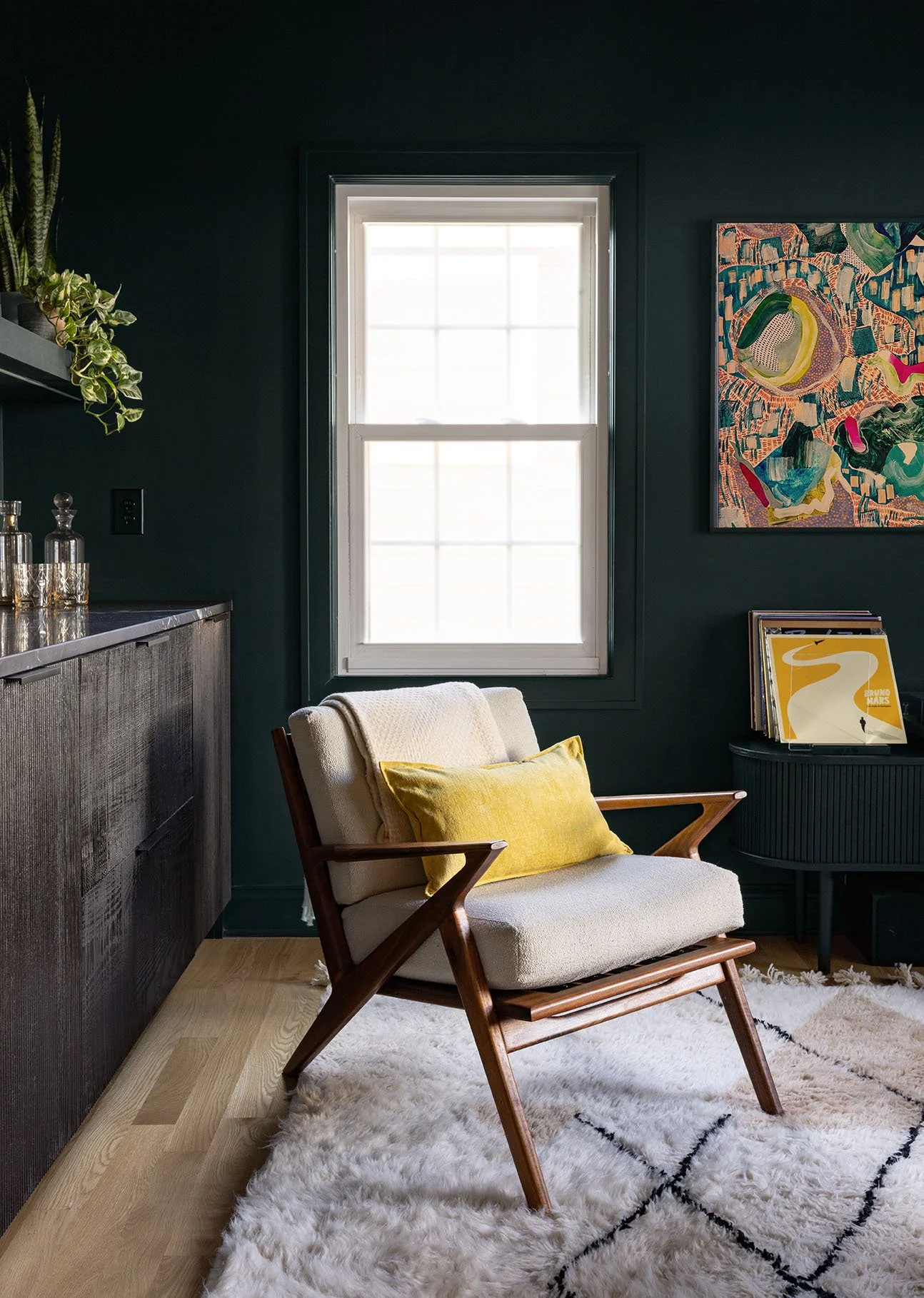 Just off the kitchen, a former bedroom has been transformed into a moody, elegant lounge, complete with a turntable and a custom sideboard creating an inviting retreat for music and conversation.