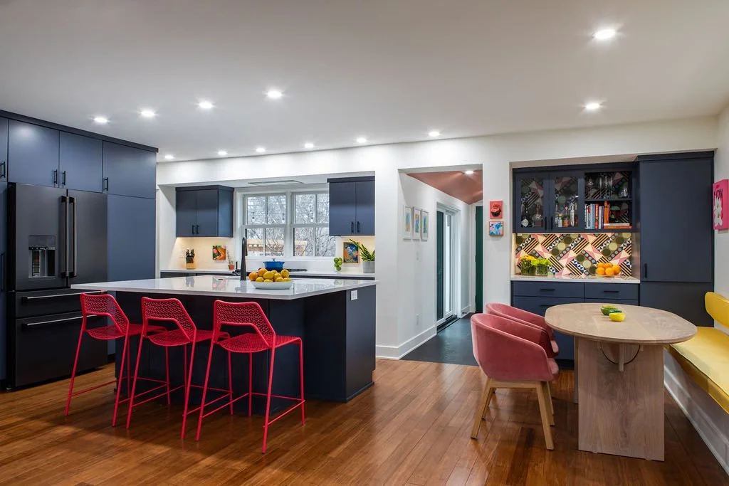 The transition from house to home is our team’s specialty. Known for creating spaces that are both livable and luxurious, we were inspired by the homeowners’ creative spirit and penchant for bold patterns and bright colors. Their love of shared but separate spaces dictated our design as we worked to incorporate a functional kitchen, new home office, mudroom with ample storage, and easy backyard access.