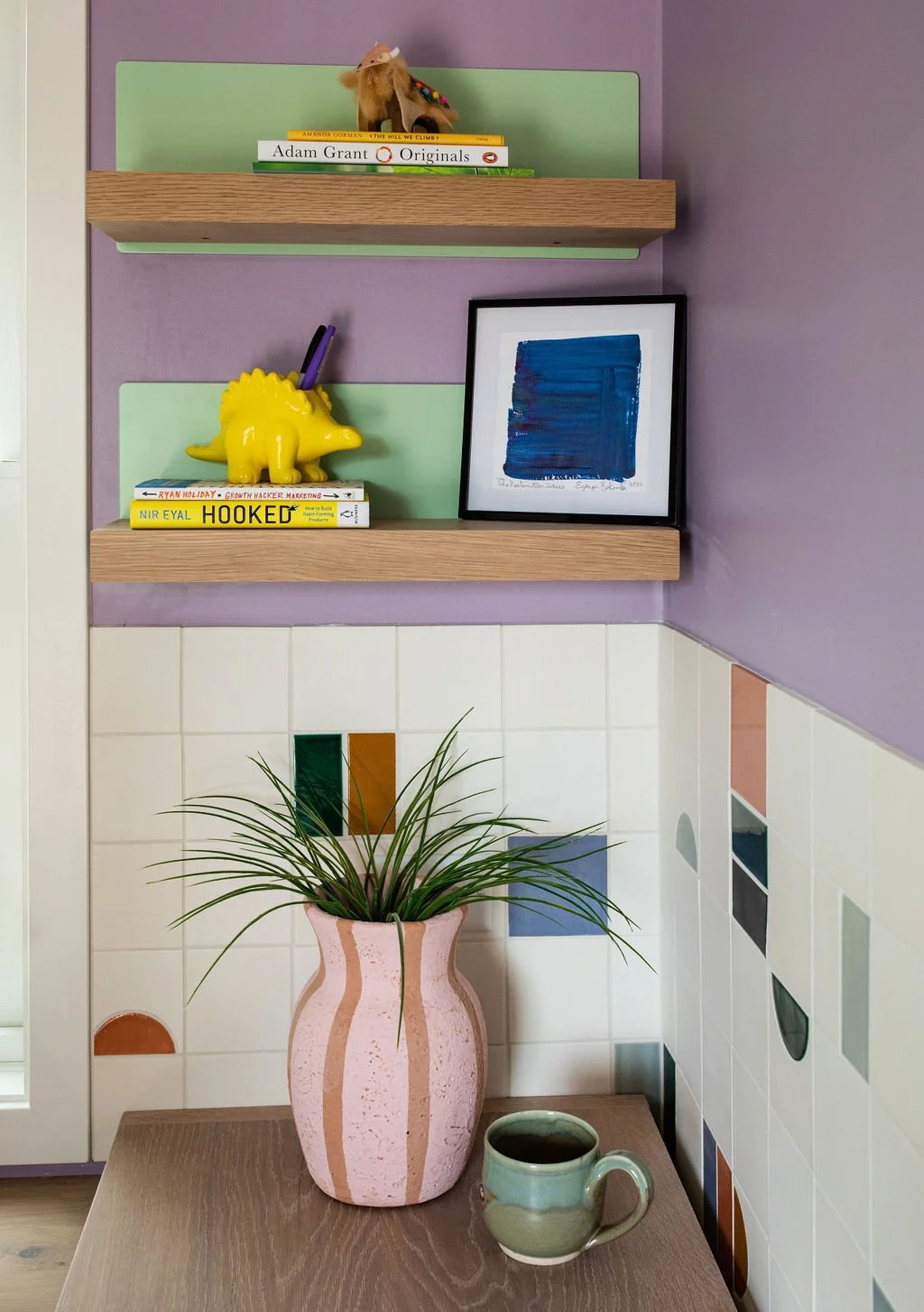 Eagerly awaiting an opportunity to bring a new concept to life, Austin received the green light from Farrell to include a mosaic pattern called Rise. Cheerfully vibrant, hand-painted triangular tiles were then installed, gracing both the office and front entry wall.