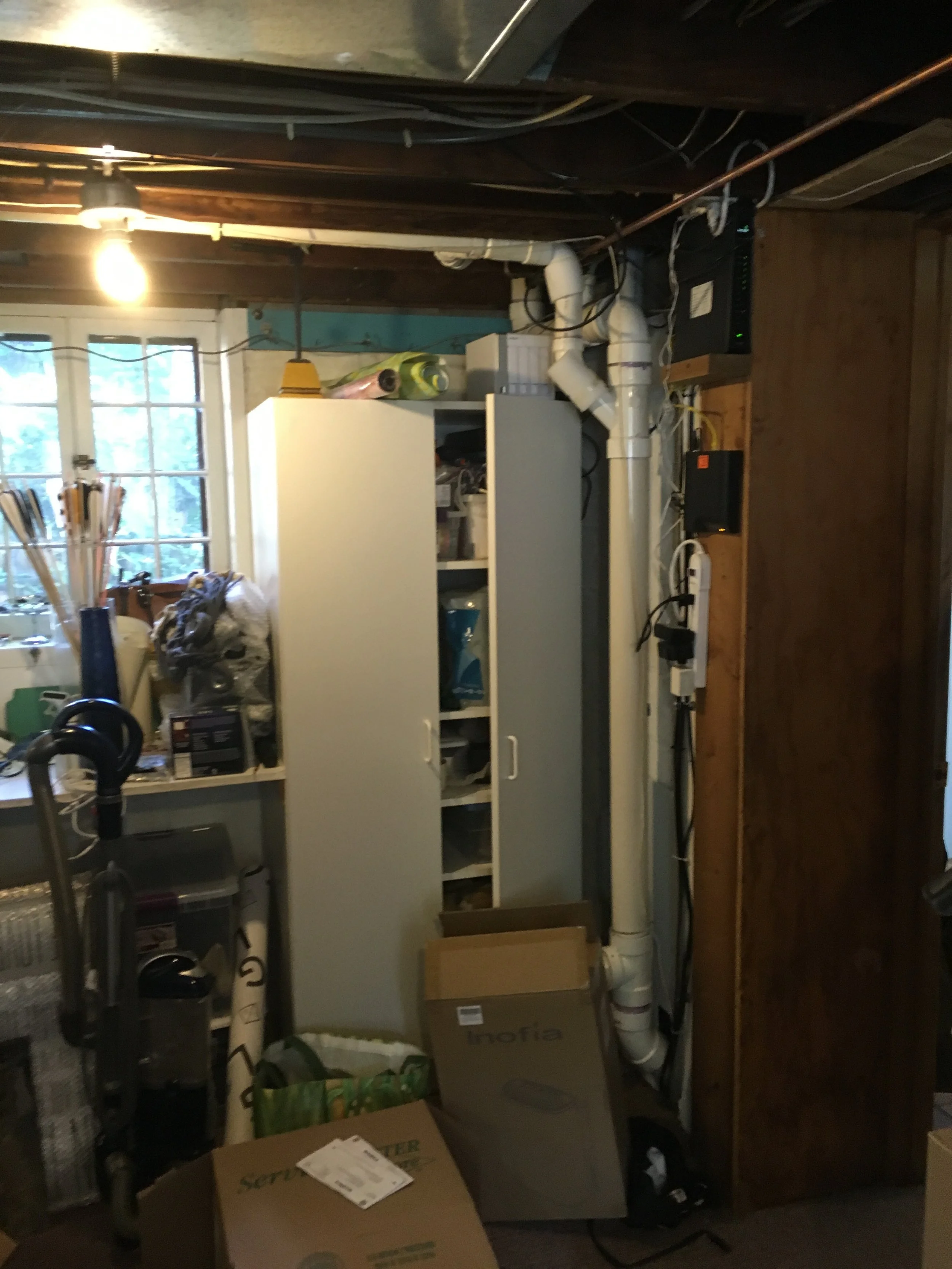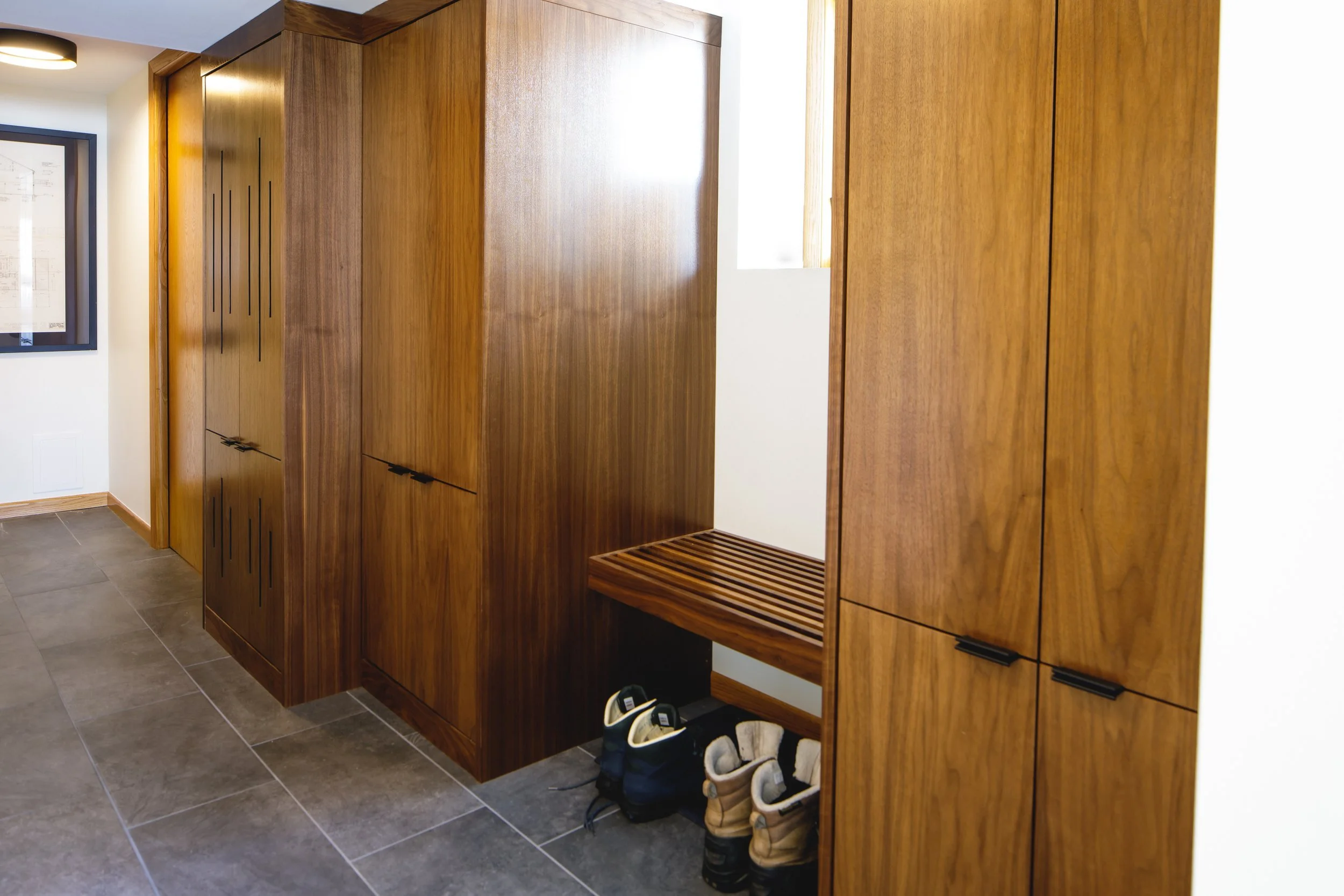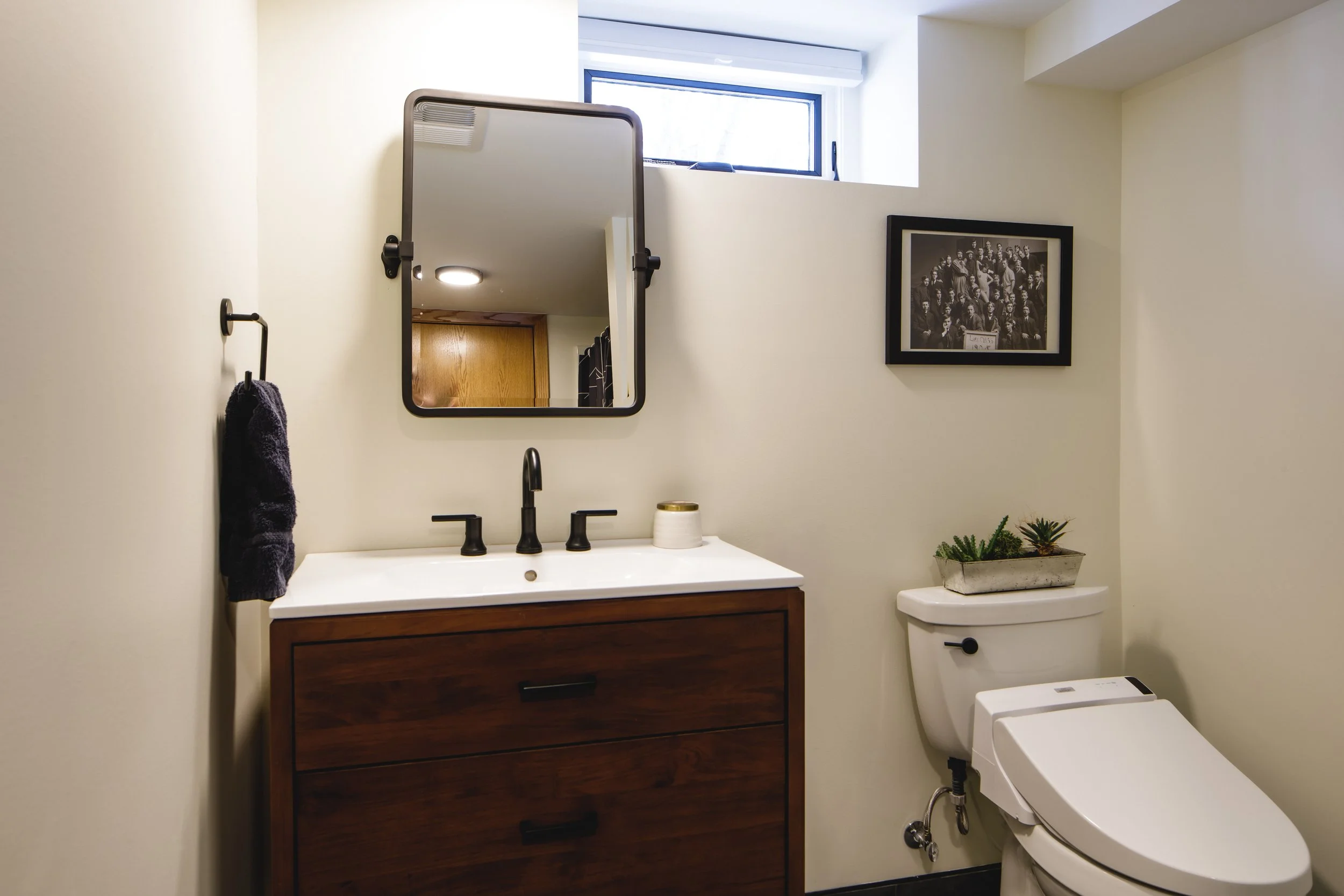 The basement area in the partially submerged back of the house was brimming with possibility. Our team masterfully transformed the space to include a second home office and a guest bathroom. Plus, there’s a utility space with new walnut built-in cabinets in the HVAC and laundry areas as well as a matching mudroom.