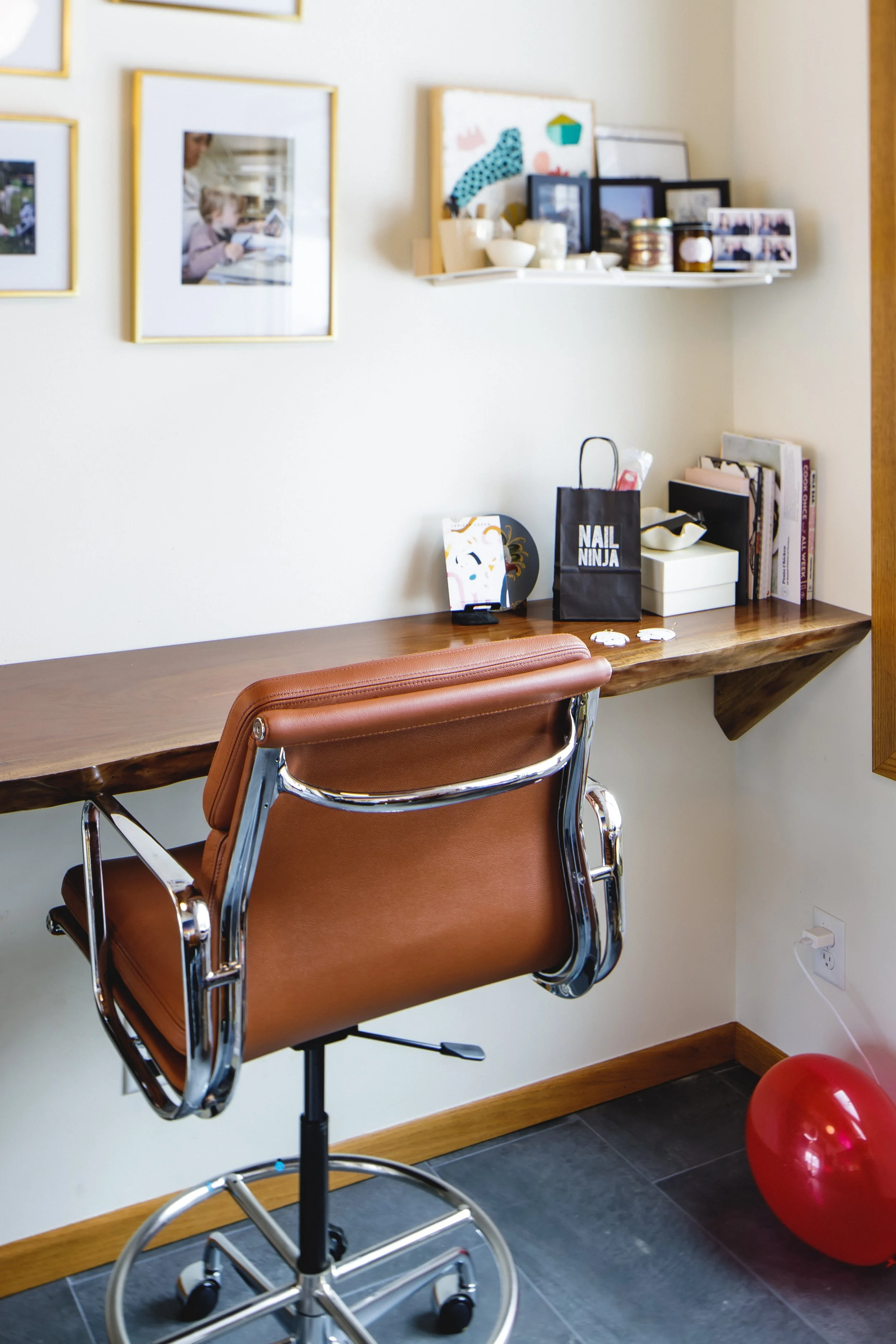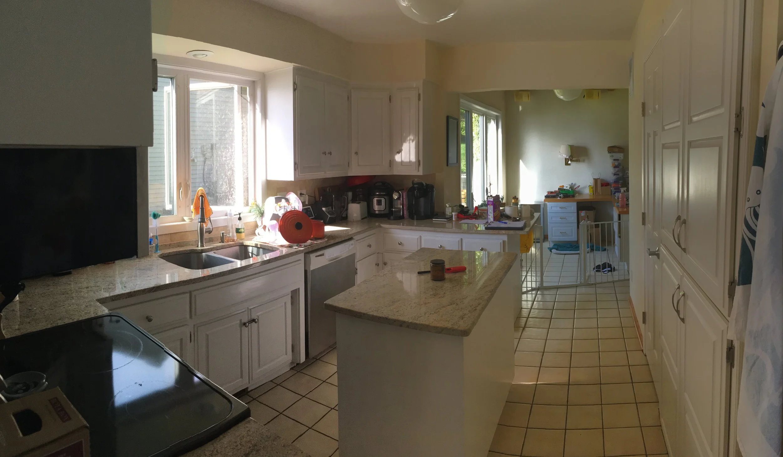 The dark, cluttered foyer provided anything but a warm welcome – but our team had a creative solution in mind. We added new windows around the door to lighten up the space, then swapped an inconvenient closet for more functional hooks and a bench. The eat-in kitchen was converted into a home office with double sliding doors to separate it from the entry.