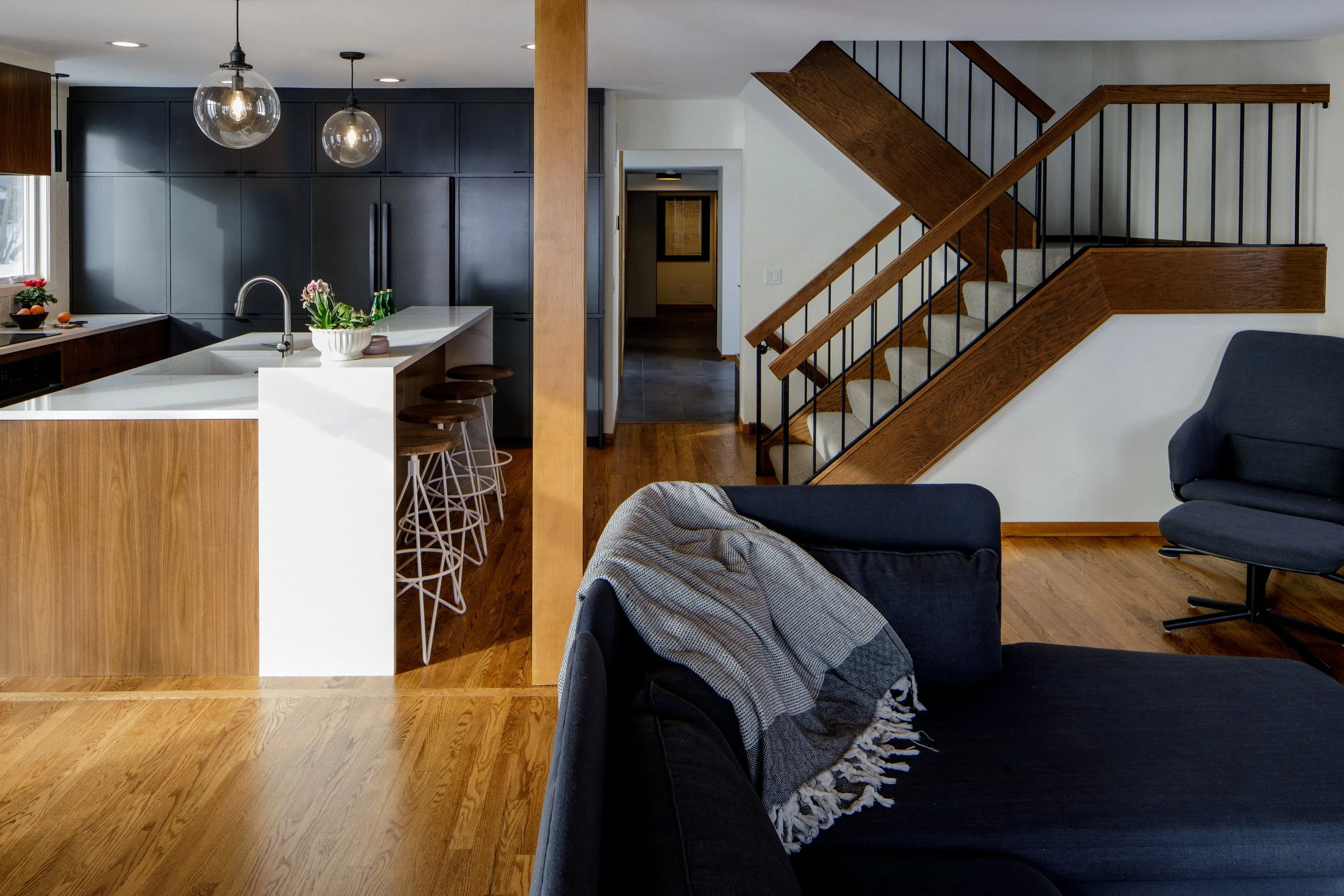 Now a chic charcoal gray fiber-cement, its captivating exterior design exudes remarkable curb appeal. The layout was amended to create more open spaces, welcome natural light, and provide better views of the lake. Our team also removed a redundant staircase at the home’s rear to make room for a mudroom and laundry room. After our total home makeover, the authentic mid-century style was restored.